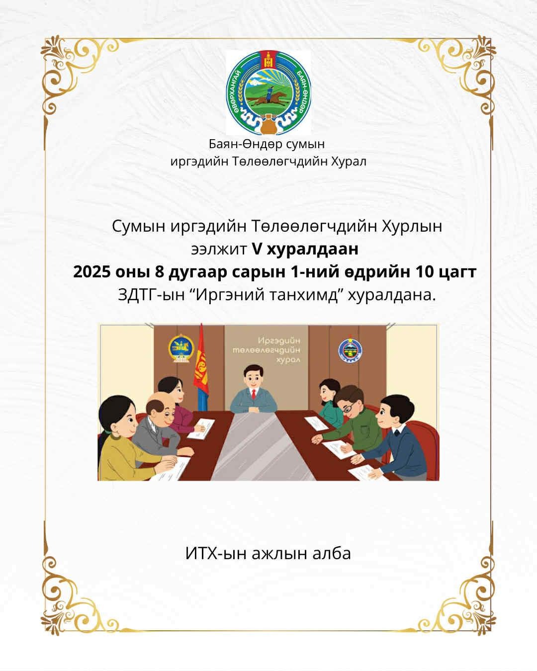 Сумын иргэдийн Төлөөлөгчдийн Хурлын ээлжит 5 дугаар хуралдааныг 2025 оны 08 дугаар сарын 01-ний өдрийн 10.00 цагт ЗДТГ-ын "Иргэний танхим"-д хуралдуулахаар товлон зарлалаа.