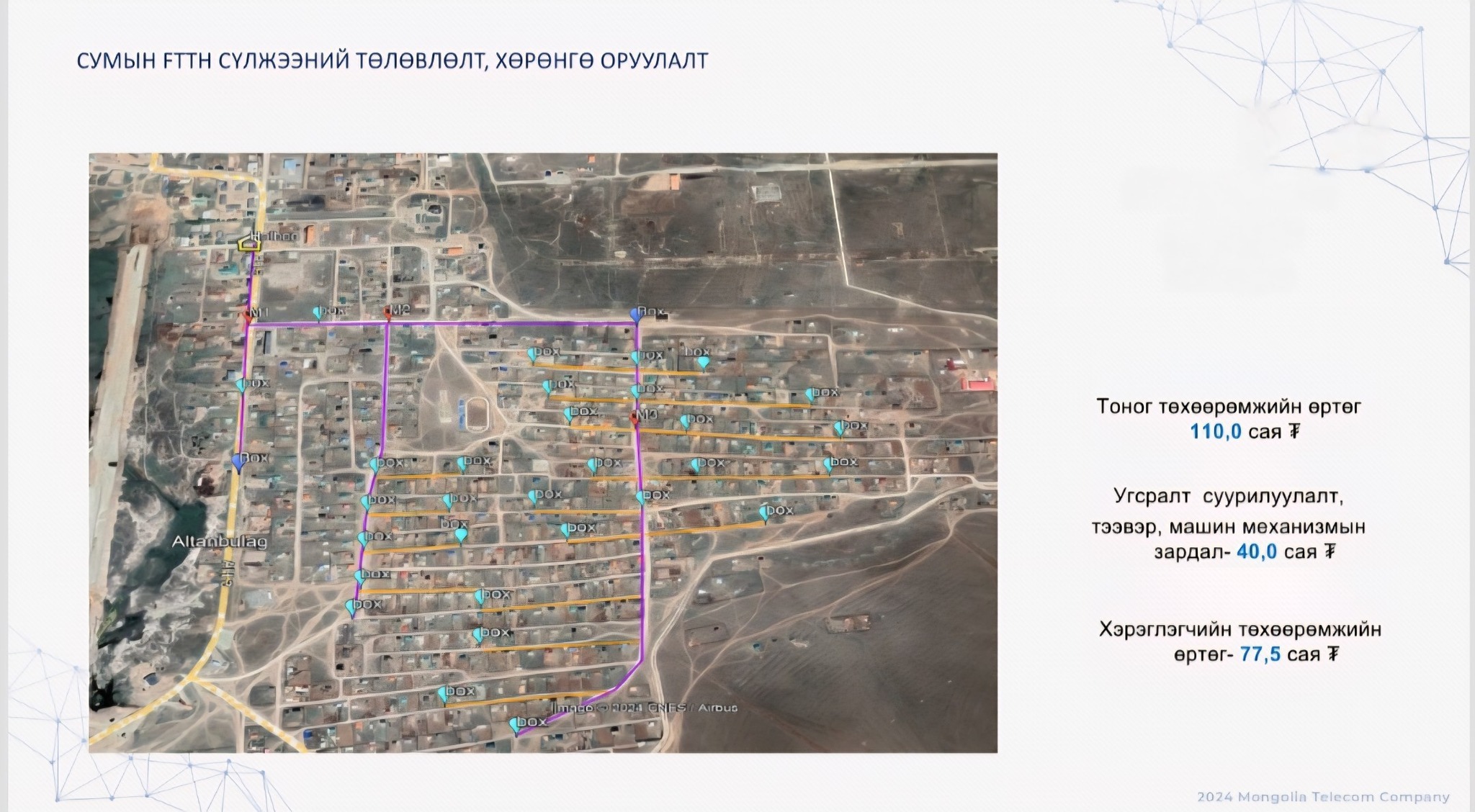 Үйлчилгээг суманд нэвтрүүлэхэд нийтдээ 110 орчим сая төгрөгийн хөрөнгө оруулалт шаардлагатай бөгөөд 40 орчим сая төгрөгийг манай сум дараа оны төсвөөс, үлдсэн 70 орчим сая төгрөгийн хөрөнгө оруулалтыг МЦХ компани өөрөө хариуцана.