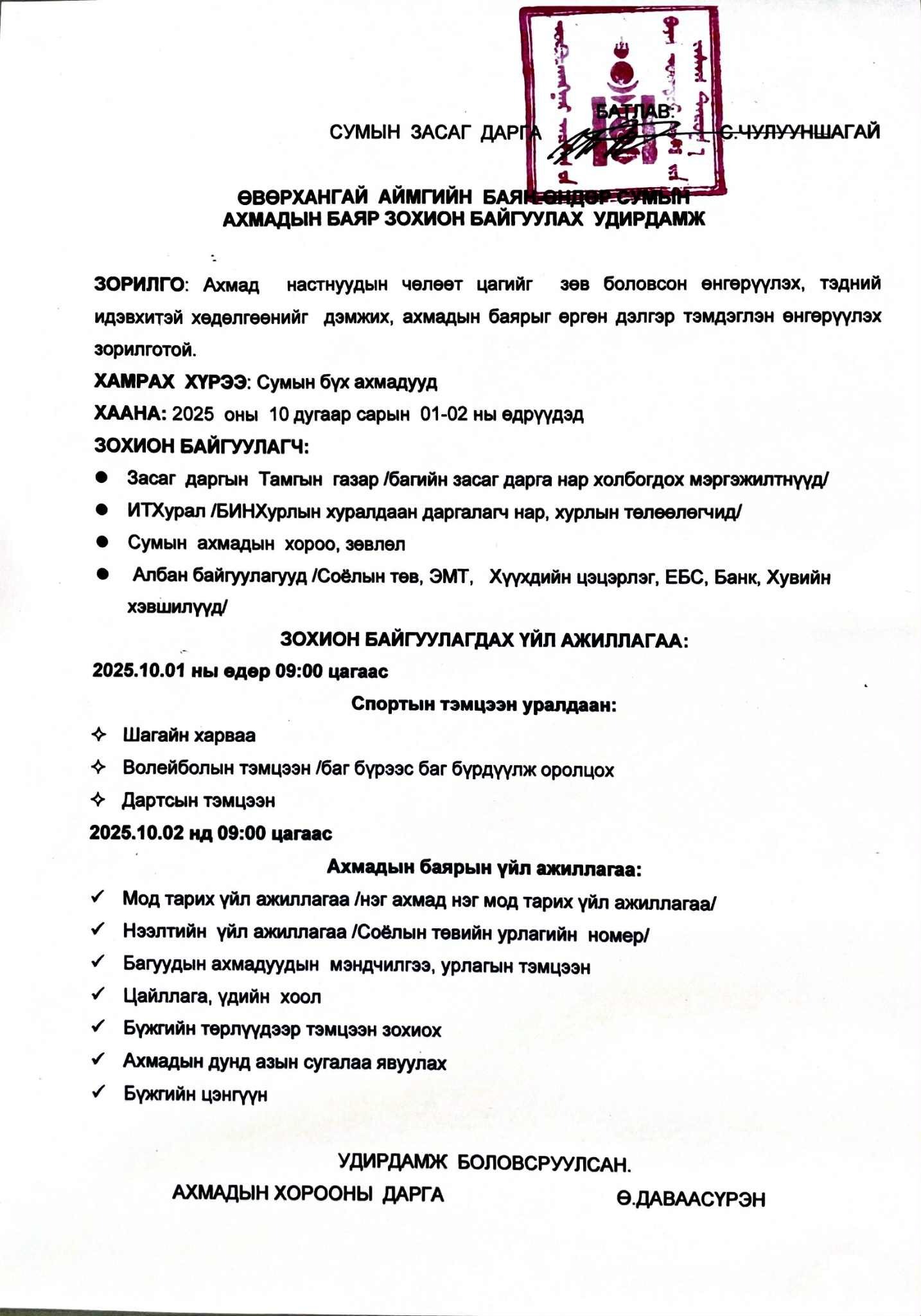 Ахмад настнуудынхаа чөлөөт цагийг зөв боловсон өнгөрүүлэх, идэвхтэй хөдөлгөөнийг дэмжих зорилгоор Ахмадын баярын спортын тэмцээн 2025 оны 10 дугаар сарын 01-ний өдөр, Баярын үйл ажиллагааг 10 дугаар сарын 02-ны өдөр тус тус зохион байгуулагдахаар боллоо.
