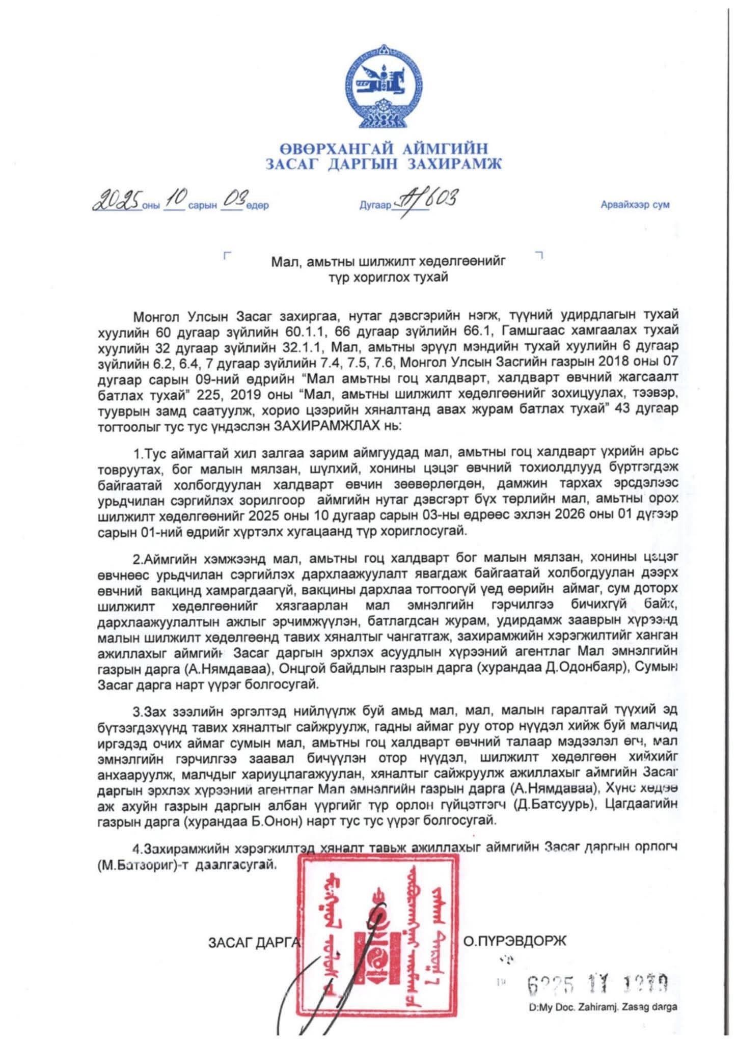 Зарим аймагт мал, амьтны гоц халдварт үхрийн арьс товруутах, бог малын мялзан, шүлхий, хонины цэцэг өвчний тохиолдлууд бүртгэгдэж байгаа тул өвчин зөөвөрлөгдөн орж ирэх эрсдлээс урьдчилан сэргийлж өөр аймаг сумдын нутгаас бүх төрлийн мал, амьтан оруулах, авахыг 2025 оны 10 дугаар сарын 03-ны өдрөөс 2026 оны 01 дүгээр сарын 01-ний өдөр хүртэл хориглосон тул өөр бусад газраас мал оруулж ирэхгүй байхыг мэдэгдэж байна.