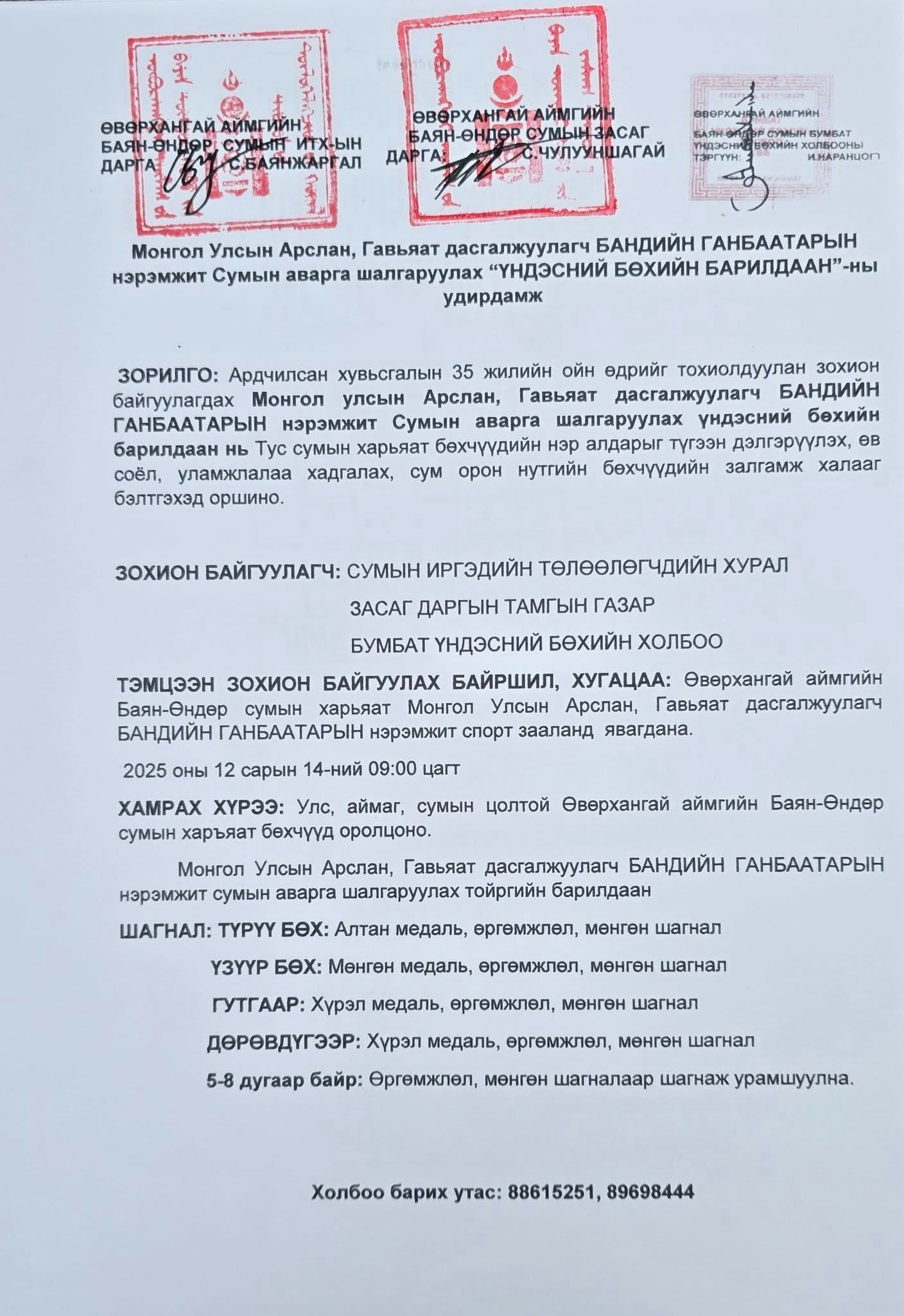 Ардчилсан хувьсгалын 35 жил, олон улсын хүний эрхийн өдөрт зориулан 2025 оны сумын Аварга шалгаруулах үндэсний бөхийн барилдааныг 2025.12.14-ний өдрийн 09 цагт зохион байгуулна.