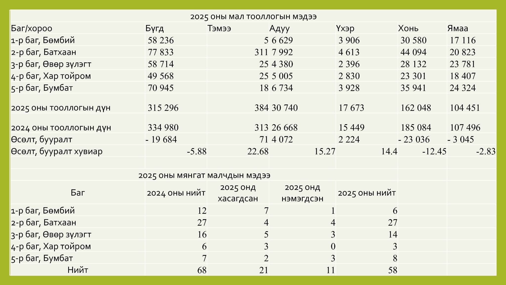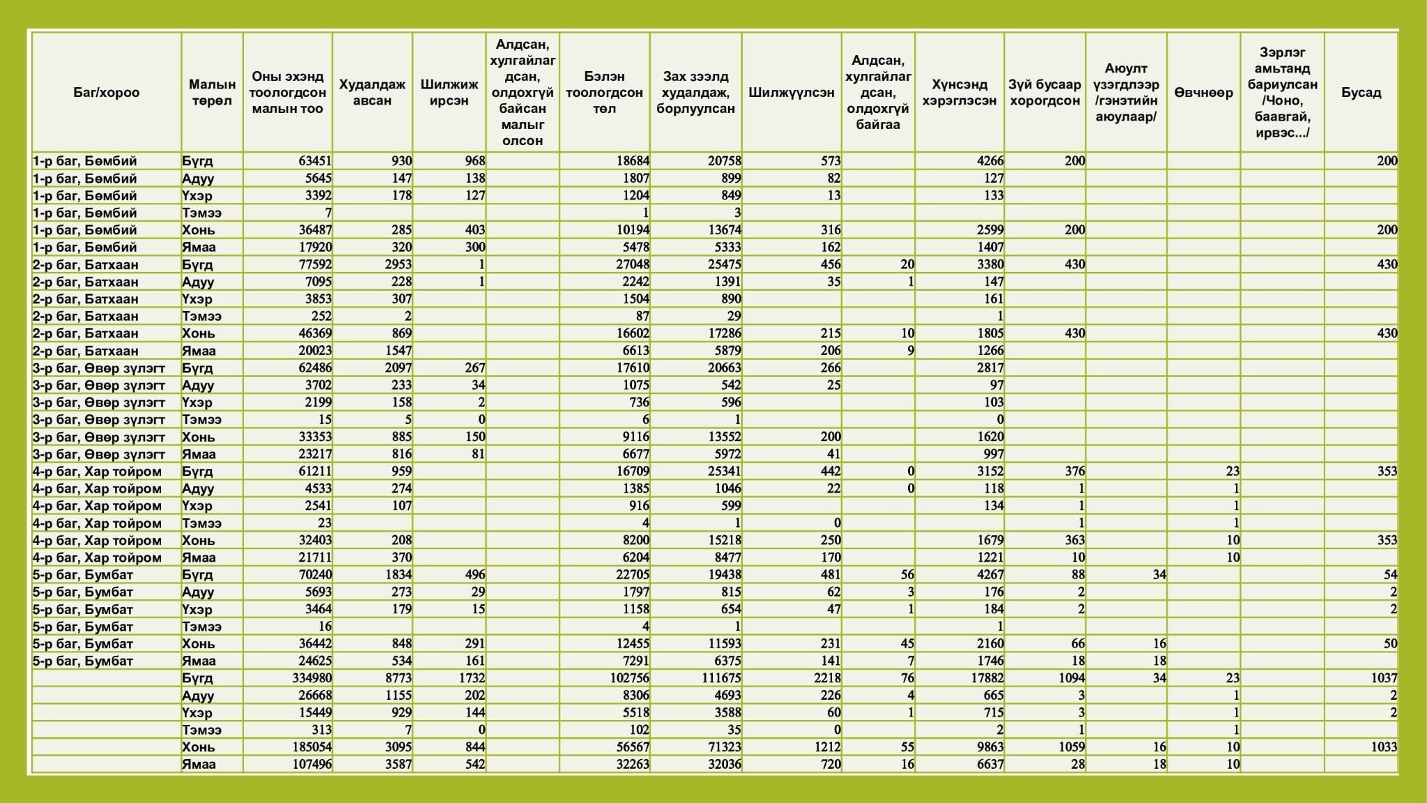 Өвөрхангай аймгийн Баян-Өндөр сум 2025 оны жилийн эцсийн мал тооллогоор нийт 315,296 мал тоолууллаа.
