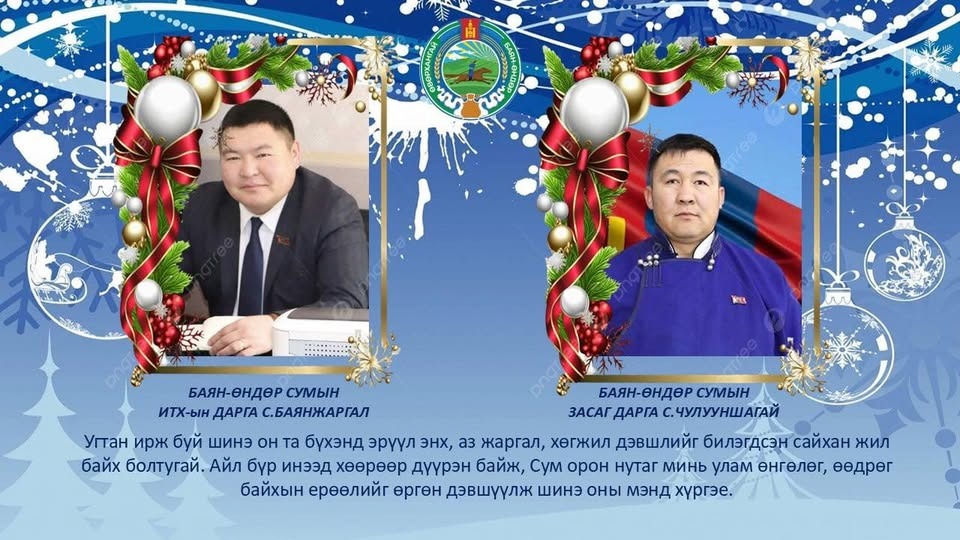 Угтан ирж буй шинэ он та бүхэнд эрүүл энх, аз жаргал, хөгжил дэвшлийг билэгдсэн сайхан жил байх болтугай. Айл бүр инээд хөөрөөр дүүрэн байж, Сум орон нутаг минь улам өнгөлөг, өөдрөг байхын ерөөлийг өргөн дэвшүүлж